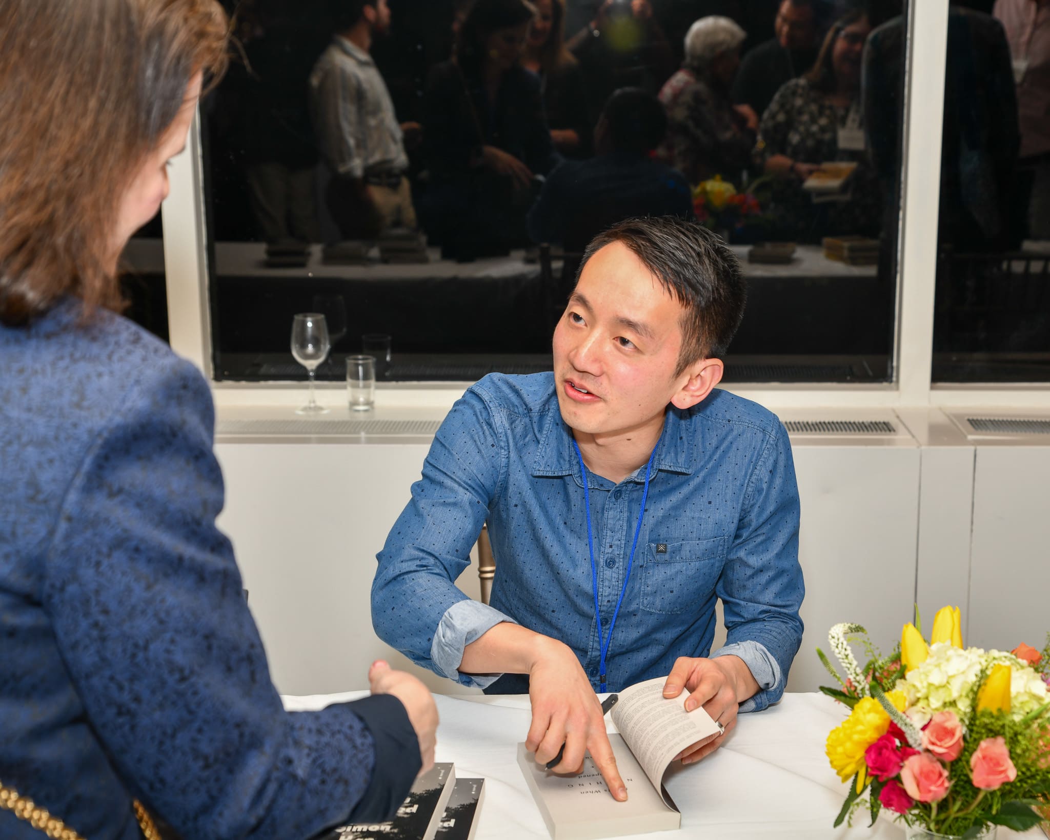 This year, we hosted Pros&Conversation fully in person at the UMass club and guests mingled with Teens in Print Students, WriteBoston staff and supporters; received on-the-spot typewriter poems from the Traveling Poetry Emporium and enjoyed spectacular views of Boston. Teens in Print students engaged in compelling conversations with featured authors, both in person and pre-recorded. Our featured students and authors discussed their lives and shared their writing inspirations and passions.