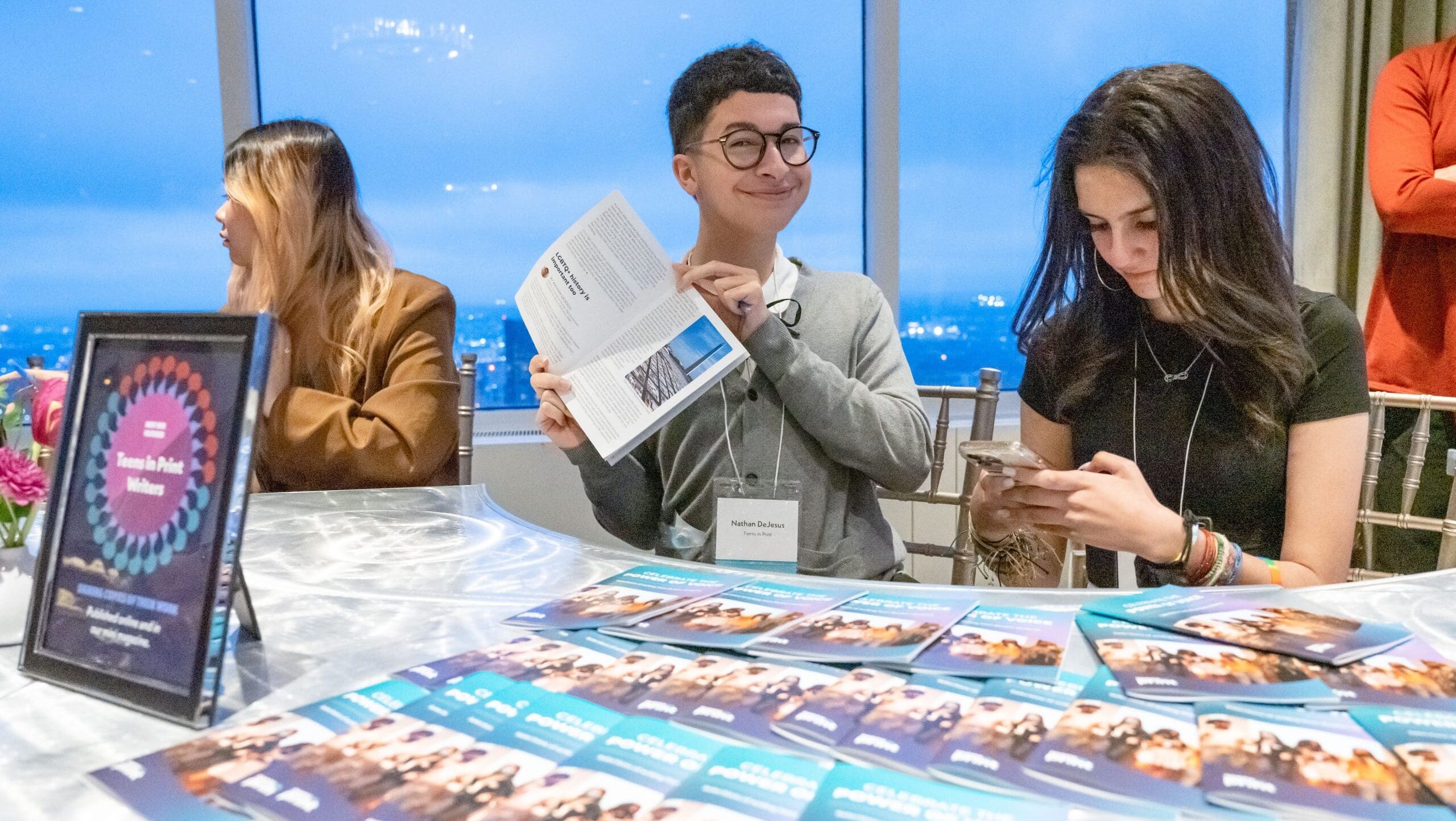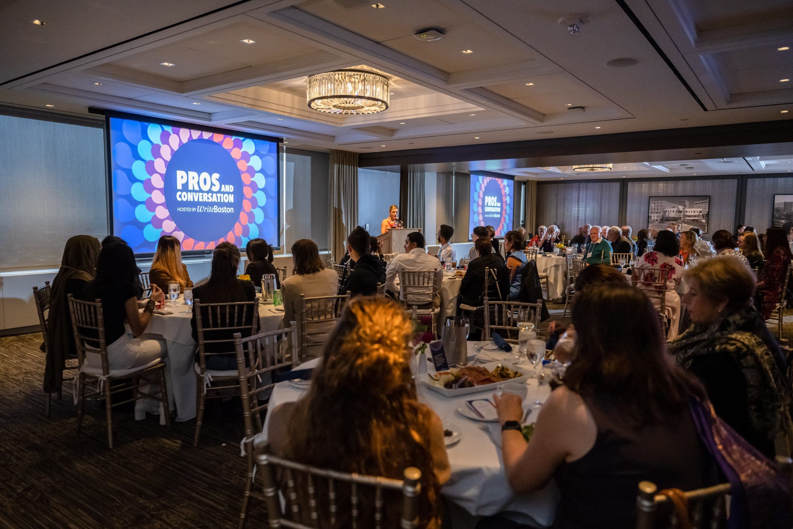 This year, we hosted Pros&Conversation in a hybrid format—guests gathered in person at the UMass club while others logged on from home to watch our debut of three compelling conversations between Teens in Print students and local authors. Our featured authors discussed their lives and writing journeys and asked students about their own.