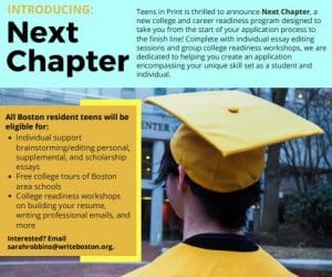 Teens in Print has been thrilled to begin Next Chapter, a college and career readiness program designed to take high schoolers from start of the application process to the finish line. In our first year, we have focused our efforts on the intimidating college essay, working with students one-on-one to assist in the essay drafting process, and creating engaging workshops to teach essay writing skills in the classroom.