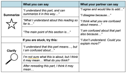 Partner Reading, a strategy adapted from Margarita Calderón and Shawn Slakk’s Teaching Reading to English Learners, Grades 6-12, has students in pairs, taking turns reading out loud to each other and stopping to summarize. The strategy can be modified by using strategic pairing, changing the length of the text chunks, etc.